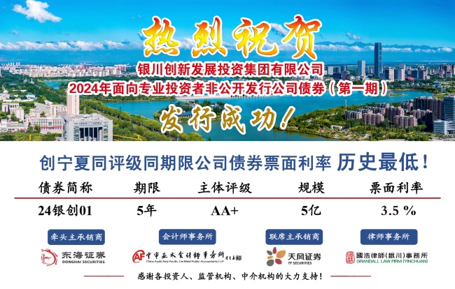 8月30日,銀川創(chuàng)新發(fā)展投資集團有限公司2024年第一期面向專業(yè)投資者非公開發(fā)行公司債券成功發(fā)行。本期債券發(fā)行規(guī)模5億元,期限:5年,票面利率:3.5%,創(chuàng)寧夏區(qū)域內(nèi)5年期私募債發(fā)行利率歷史最低。本期債券的成功發(fā)行,充分體現(xiàn)了資本市場對銀川市和創(chuàng)投集團的認可,降低了集團融資成本,為集團公司后續(xù)服務銀川市產(chǎn)業(yè)發(fā)展奠定了良好基礎。
